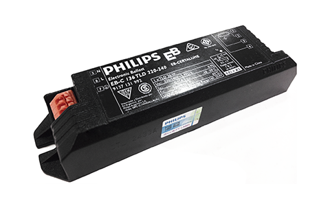 2. บัลลาสต์อิเล็กทรอนิกส์ EB-C 136 TLD (สีดำ) เหมาะสำหรับใช้ในโรงงานที่คิดค่าไฟแบบ kVA เพราะมีวงจร Power Factor Correction (PFC) ทำให้ใช้กระแสน้อยลงแต่อาจจะไม่ทนต่อแรงดันกระชาก